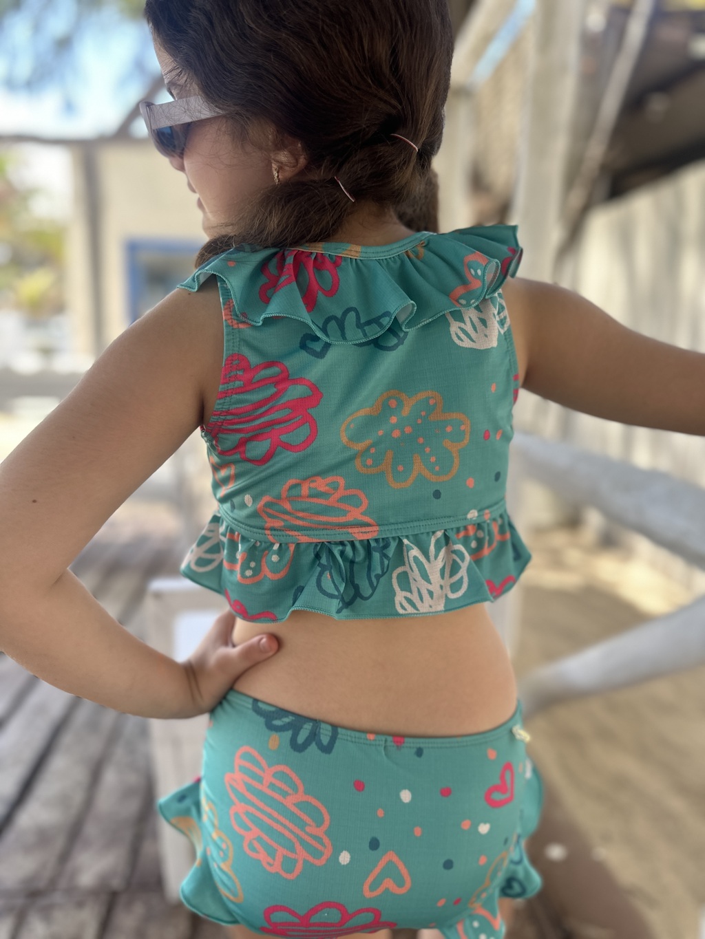 Biquini Laisa foi confeccionado pensando no conforto das crianças. Com uma com cor linda e estampa leve & alegre, o cropped possui uma leve amarração no pescoço e babados em baixo trazendo mais charme e beleza a peça. A calcinha cintura alta, com babados na lateral.